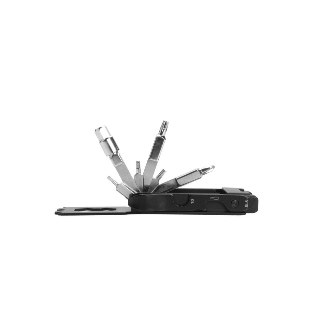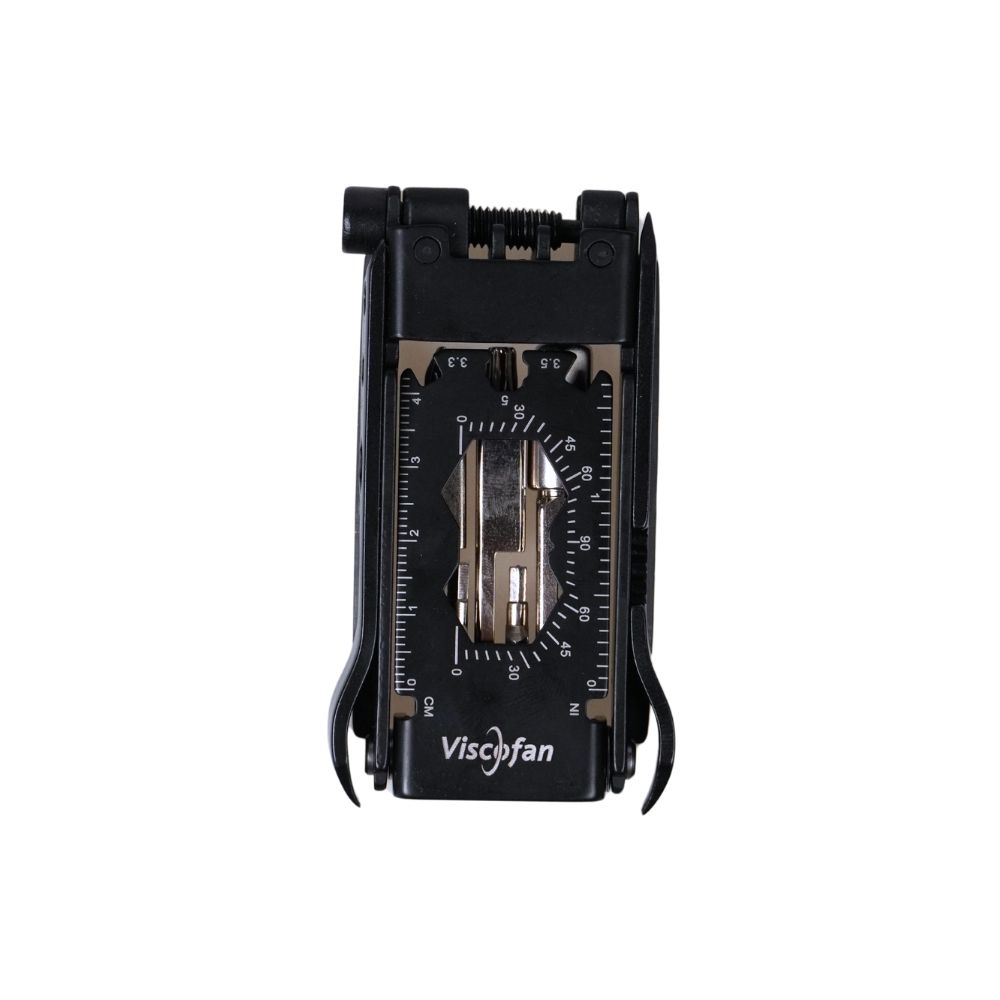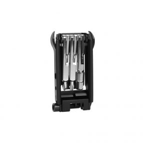 Multifunctional Schwarzwolf tool for bikers. It includes 22 tools: torx screwdriver (3 sizes), bottle opener, flat screwdriver, Philips screwdriver, 2 tire levers, chain breaker, hexagon wrench (2 sizes), spoke tool (2 sizes), 2 rulers, hex key (7 sizes). Packed in a gift box. Material: handle - stainless steel, components - chrome, vanadium steel + 420 stainless steel. Dimensions: 4 × 1.4 × 8.2 cm.