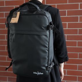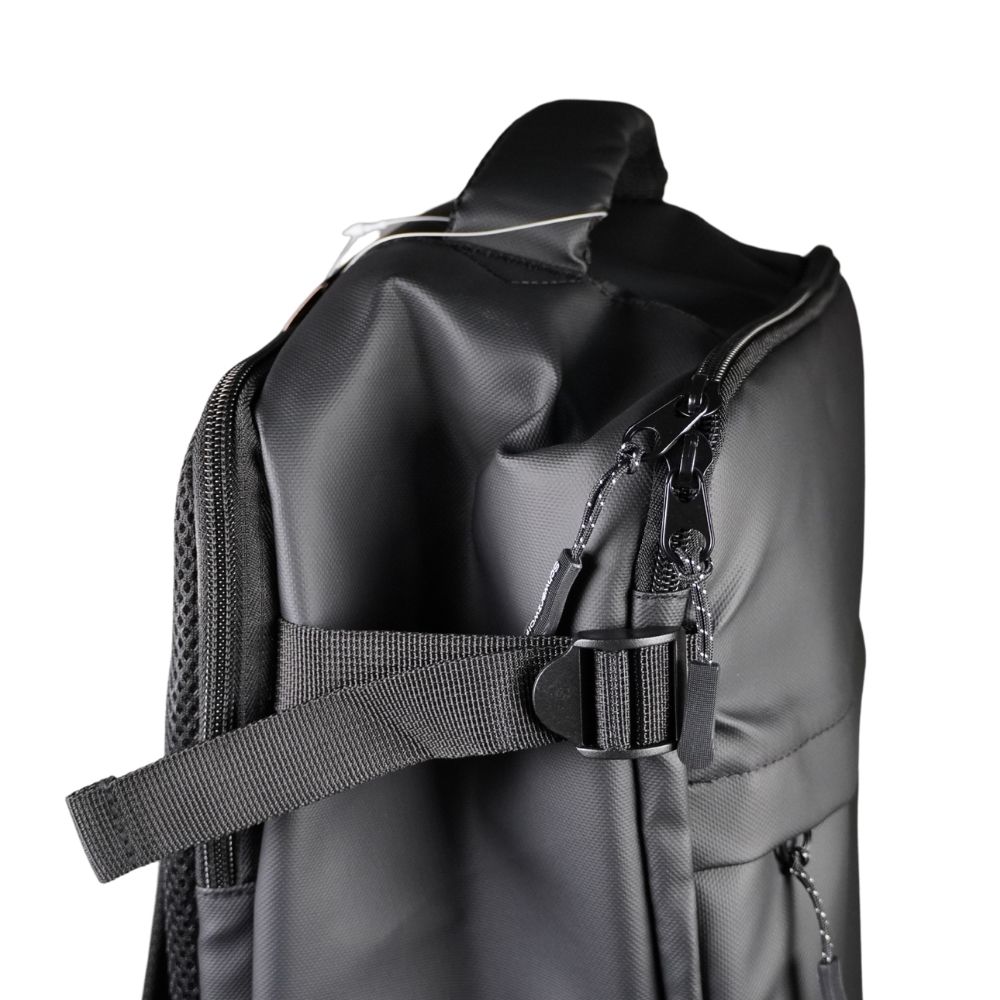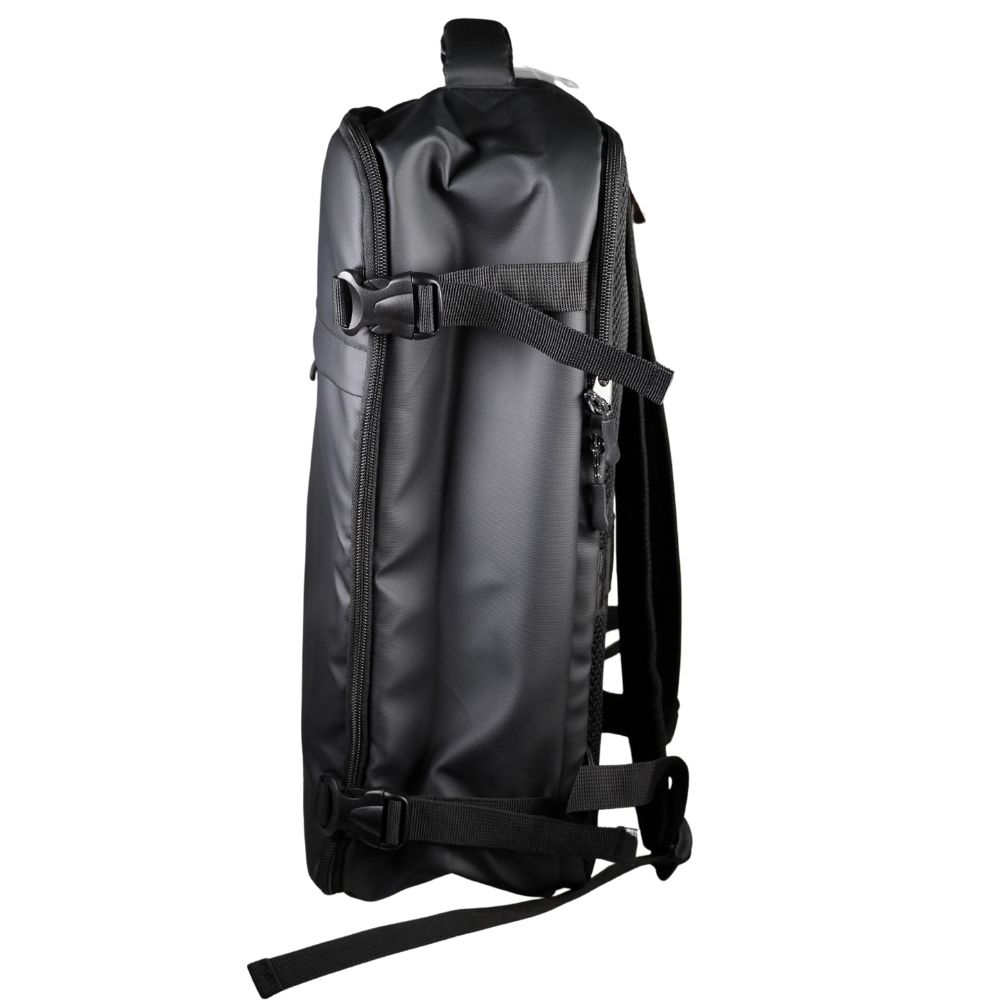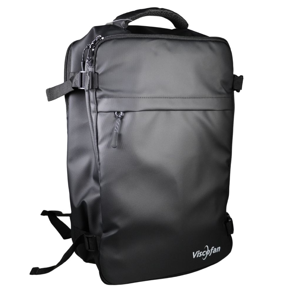 The backpack is interesting because it resembles a travel suitcase in composition and is suitable as carry-on luggage on a plane. It has an internal compartment that includes a large mesh pocket zipper and mesh pocket with zipper. The exterior of the backpack includes a front zippered pocket, a zippered pocket on the back of the backpack, and a strap to attach to the suitcase. The backpack has a padded back system and shoulder straps. Features a grab loop, two pull straps with plastic buckles on one side and two pull straps on the other side. Volume: 20 l. Weight: 703 g. Material: waterproof 900D PU reversed polyester, PE foam. Dimensions: 30 × 45 × 19 cm.