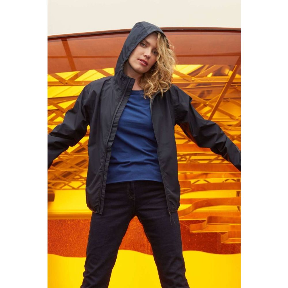 Unisex waterproof windbreaker, 100% recycled polyester with membrane, waterproof rating: 5000 mm, breathability rating: 5000 g/m2/24 h, front nylon zip fastening, side zip pockets, taped seams, elasticated drawstring at hood, elasticated cuffs and hem, reflective details.